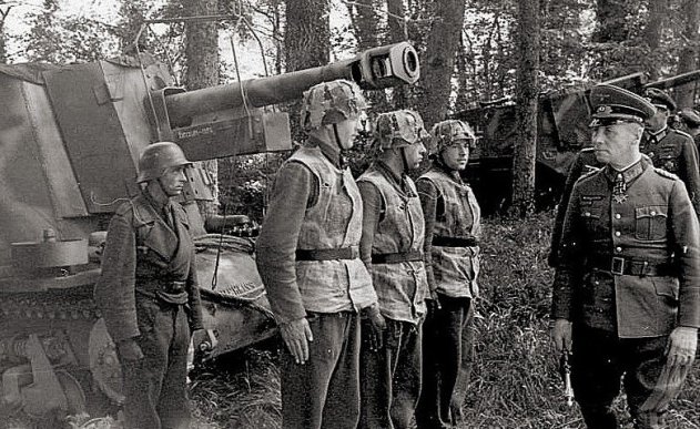Фельдмаршал Роммель инспектирует 21-ю танковую дивизию в Нормандии. 1944 г. На снимке немецкие самоходные орудия, изготовленные на базе трофейных французских таков.