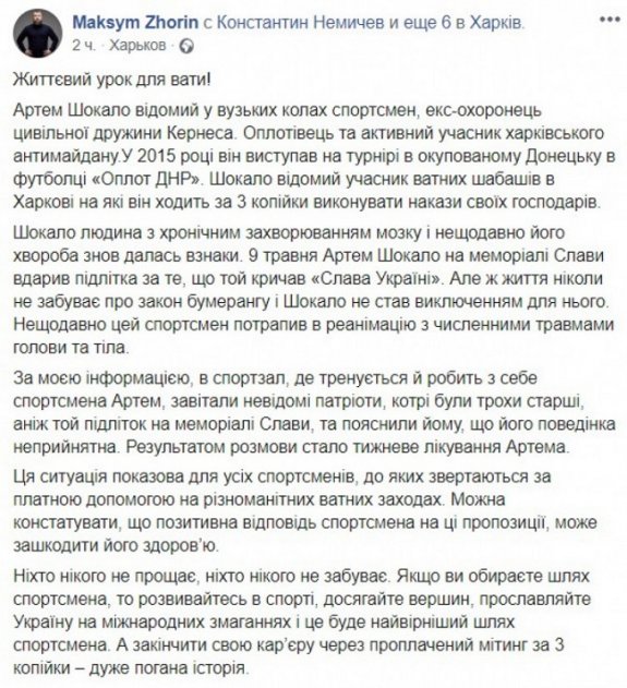 «По моей информации, в спортзал, где тренируется и делает из себя спортсмена Артем, пришли неизвестные патриоты, которые были чуть старше, чем подросток на мемориале Славы, и объяснили ему, что его поведение неприемлемо. Результатом разговора стало недельное лечение Артема», — написал представитель Нацкорпусу, добавив, что ситуация с Шокало является показательной для всех спортсменов, которые за деньги соглашаются участвовать в «разнообразных ватных мероприятиях».