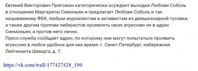 С осуждением поведения Соболь выступила петербургская компания «Конкорд», принадлежащая бизнесмену Евгению Пригожину. В сообщении, опубликованном пресс-службой, отмечается, что предприниматель предложил сотрудникам ФБК и всем другим представителям демшизы нападать на него, а не на Симоньян.