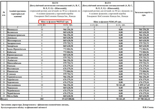 А как бы, информация то шокирующая. Та самая сыворотка, которую Украина не видела последние несколько лет и которую закупали раннее в России по цене в 500 гривен за упаковку в пять ампул(!), на сегодня оказалась несусветно дорогой — аж по 96.6 тысяч за одну(!) ампулу. И это подаётся как достижение и успех на фоне того, что последние два года эта сыворотка поступала в страну как гуманитарная помощь в 20 ампул на год. Всех устраивает, полагаю, как и всё творимое министеркой-смерть.