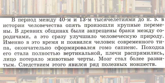 Очень часто допускаются ляпы в смежных темах, которые неизбежно затрагиваются в учебниках, — например, начальный период истории человечества. Есть ощущение, что авторы остались в 70-х–80-х годах и открытия последних десятилетий прошли мимо них.