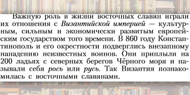 Далее учебник рассказывает об эпической борьбе норманистов и антинорманистов. Он излагает различные версии того, кто такие русы, и внезапно ставит школьника перед фактом, что это — прибалтийские славяне.