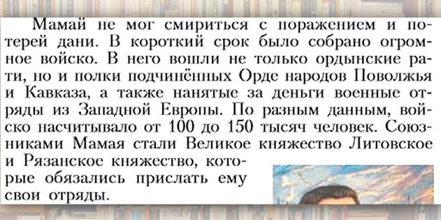 А вот описывая Куликовскую битву, учебник Данилова и Косулиной пишет, что, по разным данным, войско Мамая там насчитывало от 100 до 150 тысяч человек.