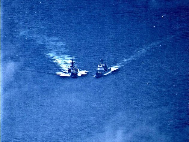 На этих двух снимках совершенно четко видно, что именно российский корабль меняет курс для уклонения от возможного столкновения. В то время как американский крейсер, обязанный по правилам «уступить дорогу», продолжает «переть буром» вперед.