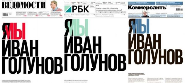 10 июня три крупных российских деловых издания: «Ведомости», «Коммерсант» и РБК — впервые вышли в одинаковой первой полосой, поддерживая таким образом журналиста «Медузы» Ивана Голунова, задержанного 6 июня в Москве по подозрению в покушении на незаконный сбыт наркотиков в крупном размере.
