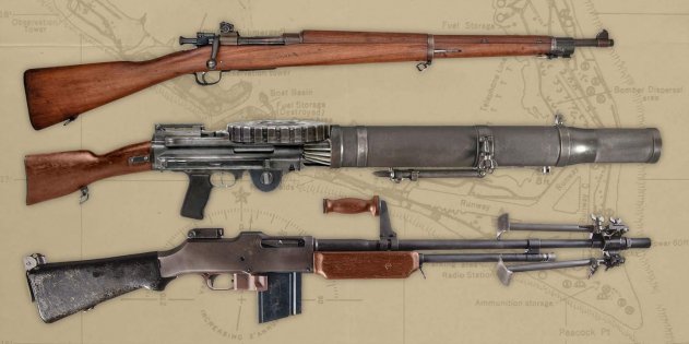 Стрелковое оружие армии и морской пехоты США на начало войны: магазинная винтовка «Спрингфилд» М1903, лёгкий пулемёт Льюиса, автоматическая винтовка Браунинга М1918А2 «Дикие коты» редкой породы