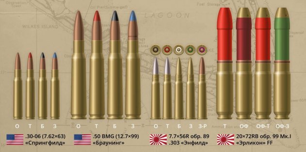 Авиабоеприпасы ВМС США и Японии начала Второй мировой. Тип пули/снаряда: О -обычные, T — трассирующие, Б — бронебойные, З — зажигательные, Р — разрывные, ОФ — осколочно-фугасные А дальше целый майор детально расписывает, что 2800 этих дефицитных патронов выделили 221-й истребительной эскадрилье, а оставшиеся 1200 — стрелкам патрульных летающих лодок «Каталина». То есть аж по 25 штучек на каждый пулемёт и тем и другим. Пилотам пикировщиков и зенитчикам не досталось ни одного. Дефицита трассирующих, к счастью, не было.