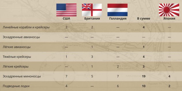 В декабре 1941 года американцы оказались в очень непривычной и непонятной для нас, нынешних, ситуации. Внезапно выяснилось, что им противостоит сила, по многим аспектам превосходящая их как количественно, так и качественно. И лучше всего это иллюстрирует соотношение безвозвратных потерь кораблей обеих сторон конфликта за первые полгода войны на Тихом океане.