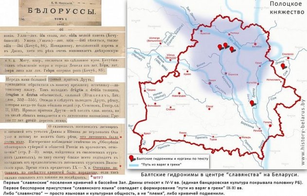 Белорусские националисты распространяют исторические мифы с целью утвердить антирусскую идентичность белорусов и отдалиться от России. Мы уже рассмотрели один из таких конструктов, согласно которому Беларусь пошла от Полоцкого княжества народа кривичей. В продолжении разберем мифы националистов о том, что белорусы — не славяне, а Беларусь — это Литва. Белорусы — балты Этот миф появился сравнительно недавно, во второй половине ХХ века. Отправной точкой для него могли послужить изыскания советского археолога Валентина Седова, изучавшего роль «балтского субстрата» в этногенезе восточных славян. В частности, выраженные балтские влияния были обнаружены в археологической культуре тех же кривичей. Это и стало основанием для утверждения, что на самом деле белорусы — это этнические балты, перешедшие на славянский язык. Балтский миф удобен для проведения жесткой границы между белорусами и другими восточными славянами и для исключения белорусов из «общерусского» контекста. В современной Беларуси главными популяризаторами балтского мифа стали весьма плодовитый автор многочисленных псевдоисторических сочинений Анатолий Тарас, а также Вадим Деружинский, издатель желтой газеты «Секретные исследования», которая специализируется на псевдонаучных «сенсациях». То, что расселение славян на территории современной Беларуси сопровождалось вытеснением и ассимиляцией более раннего балтского населения, известно давно. В Беларуси много топонимов и гидронимов балтского происхождения, нередки и белорусские фамилии с балтскими корнями. Правда, помимо балтского, присутствует также влияние и финно-угорского субстрата, особенно в северных областях. Балтские влияния не являются отличительной чертой исключительно Беларуси. Когда-то балтские племена были распространены по всему северо-западу Русской равнины. Для подтверждения связи балтов с белорусами создаются карты с указанием топонимов и гидронимов балтского происхождения. Приводим пример с сайта «Краткая история Беларуси» Немало балтских топонимов встречается и на территории России (в частности, подмосковный город Можайск), а балтское племя голядь проживало на территоии Московского государства еще в XV веке. По некоторым версиям, и само название Москва имеет балтское происхождение. Так что при желании балтский миф можно развернуть как аргумент в пользу братства белорусов и русских. Любопытно, что белорусские национальные деятели начала ХХ века были склонны акцентировать как раз чистоту славянского происхождения белорусов в сравнении с русскими и украинцами. В таком духе выдержана публицистика белорусского поэта М. Богдановича или исторические сочинения М.В. Довнар-Запольского. Более того, по их мнению, именно белорусы лучше других восточных славян сохранили культурное наследие Древней Руси. Можно сказать, что любимый президентом Беларуси Александром Лукашенко лозунг «белорусы — это русские со знаком качества» был придуман уже тогда. Современным белорусским национализмом эти идеи, однако, не востребованы. Белорусы — это литвины, а Беларусь — Литва Это, пожалуй, самый популярный белорусский национальный миф, который сводится к тому, что Великое княжество Литовское было белорусским национальным государством, а «истинное» имя белорусов — литвины. Главной проблемой