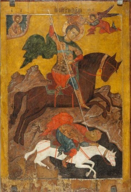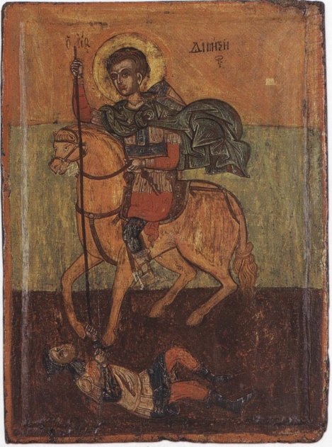 "Чудо Димитрия Солунского о царе Калояне", русская икона начала XVII в., Каргопольский государственный музей. Иконописец отошел от канона, изобразив Калояна верхом на коне