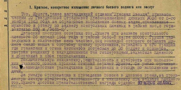 «Исключительную инициативу, решительность и храбрость при выполнении дневного поиска проявил старший сержант Жулега. Он умело организовал взаимодействие разведчиков при пленении и отходе по выполнении задачи».