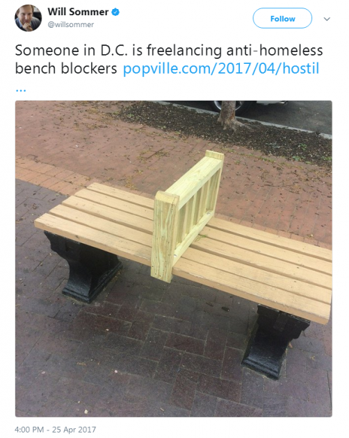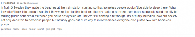 “В Мальмё (Швеция) стали делать скамейки на вокзалах под наклоном так, чтобы бездомные не могли спать на них. Но они не учли того, что скамейки имели такой наклон, что и сидеть на них невозможно, и городским властям пришлось переделывать их, поскольку люди стали подавать иски в суд из-за того, что скамейки представляют риск для тех, кто сидит на них, потому что с них легко соскользнуть и упасть. Но они до сих под некоторым наклоном. Вообще, удивительно не только обращение с бездомными в обществе, но и меры борьбы, которые делают жизнь всех неудобной только ради того, чтобы навредить бездомным людям.”