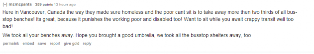 “Здесь в Канаде, в Ванкувере для того, чтобы бездомные не сидели на скамейках, убрали более двух третей всех скамеек на остановках! Великолепно, но теперь это создает неудобство бедным работающим людям, а еще инвалидам! Захотел посидеть и подождать отвратительный в плане качества общественный транспорт- не получится!