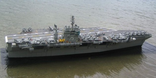 «Гарри Трумен» Малле Хокинга. Нет, плавать модель, увы, не умеет. Если присмотритесь — она опирается подставкой на дно Четырьмя годами позже британский художник Эд Димент представил публике модель другого американского авианосца — «Интрепид». Её длина составляла семь метров, вес — около четверти тонны. Модель выставлена на борту настоящего «Интрепида», превращённого в корабль-музей.
