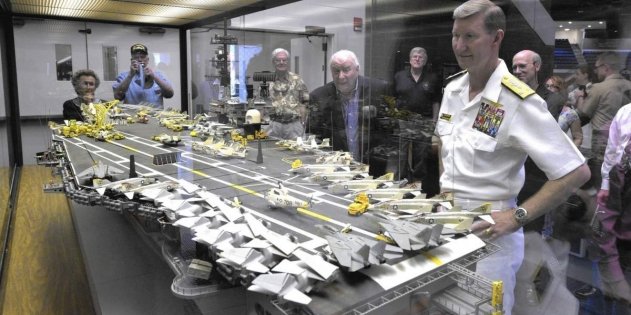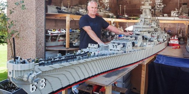 Игрушечный «Интрепид» на ангарной палубе настоящего В 2015 году состоялась драматическая заочная дуэль двух моделистов. Оба они хотели побить рекорд предшественников, построив самый крупный LEGO-корабль, и оба по странному совпадению выбрали в качестве прототипа модели американский линкор «Миссури», прославившийся тем, что на его борту 2 сентября 1945 года была подписана капитуляция Японии, завершившая Вторую мировую войну. Шотландский рыбак Джим Макдоног три года строил в гараже модель из более чем миллиона деталей, но, завершив работу, обнаружил, что американец Дэн Сискинд построил аналогичную модель немного раньше, и вдобавок более длинную — 8,45 метра против его 8 метров. Правда, сам Макдоног себя проигравшим не считает — во-первых, его линкор получился куда более красивым и детализированным, а во-вторых, он, в отличие от модели Сискинда, собран «по-честному», без использования клея. Сейчас шотландец занимается постройкой модели авианосца «Саратога» — и на этот раз намерен оказаться впереди планеты всей не только по детализации модели, но и по размеру. Пожелаем ему удачи.