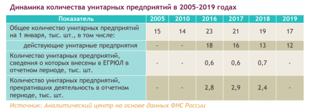 В 2019 году количество унитарных предприятий в России составило 17 тыс. При этом в последние годы наблюдалось их постепенное снижение на 2,4–2,9 тыс. ежегодно. В то же время каждый год создавалось порядка 600 новых предприятий данной организационно-правовой формы.