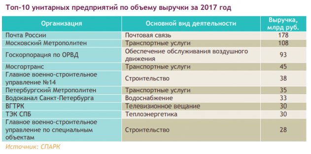 2017 году общий объем выручки унитарных предприятий составил 2,2 трлн руб., при этом на 10 крупнейших организаций пришлось 617 млрд руб., или 28% от общего объема выручки. Данные по выручке унитарных предприятий представлены только по 9,7 тыс. компаний. Средний объем выручки, за исключением 10 крупнейших организаций, составил в 2017 году 164 млн руб. При этом для 8,3 тыс. объем выручки не превысил 120 млн руб