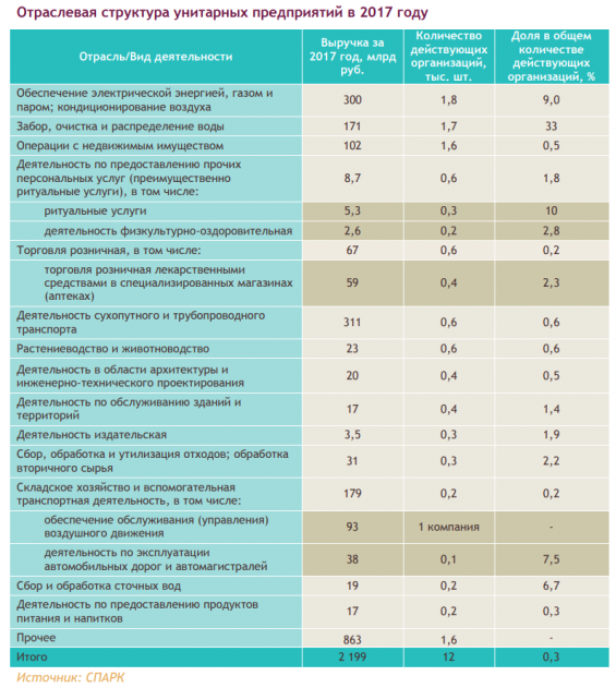 Доля унитарных предприятий в общем количестве организаций в России, по данным СПАРК, составляет порядка 0,3%, а выручка большинства не превышает 120 млн руб. Многие унитарные предприятия осуществляют деятельность в социально значимых сферах. Относительно высокая доля унитарных организаций присутствует и в ряде конкурентных отраслей: ритуальные услуги (10% в общем количестве компаний в данной сфере), деятельность по эксплуатации автомобильных дорог и автомагистралей (7,5%), деятельность физкультурнооздоровительных комплексов (2,8%) и торговля лекарственными средствами (2,3%).