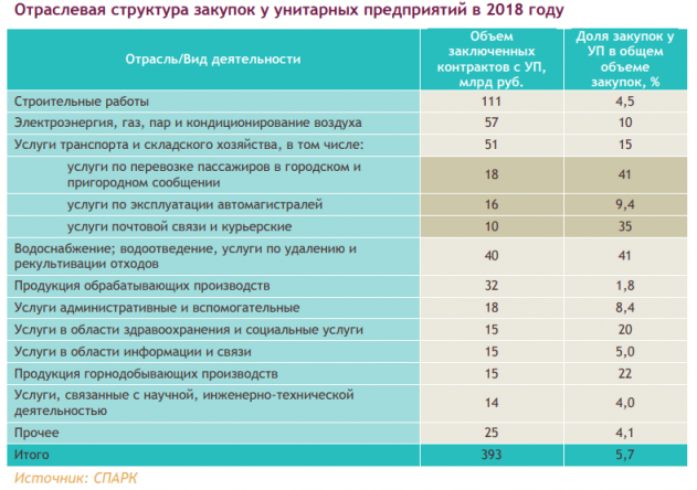 Объем закупок в рамках Федерального закона от 05.04.2013 №44-ФЗ «О контрактной системе в сфере закупок товаров, работ, услуг для обеспечения государственных и муниципальных нужд» у унитарных предприятий составил в 2018 году 393 млрд руб., из которых только 50% было разыграно в рамках конкурентных процедур.