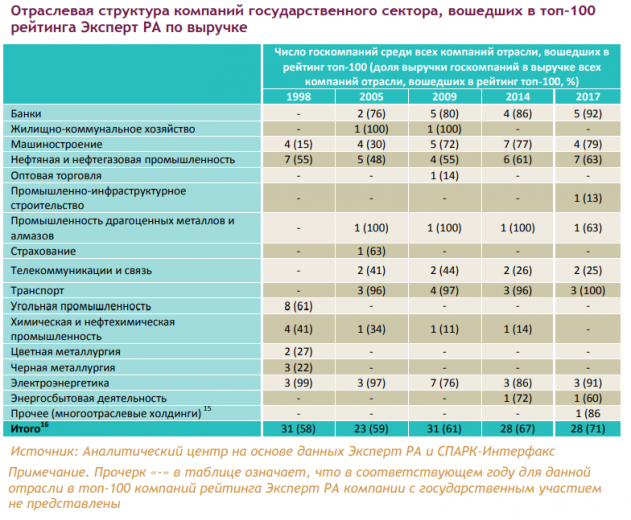 Из 100 крупнейших компаний, представленных в рейтинге Эксперт РА за 2017 год, 28 компаний являются компаниями с государственным участием (доля госучастия не менее 25%), в них работают 5,5% всех занятых в российской экономике в 2017 году. Доля выручки компаний государственного сектора в совокупной выручке топ-100 компаний в 2017 году составила 50%.