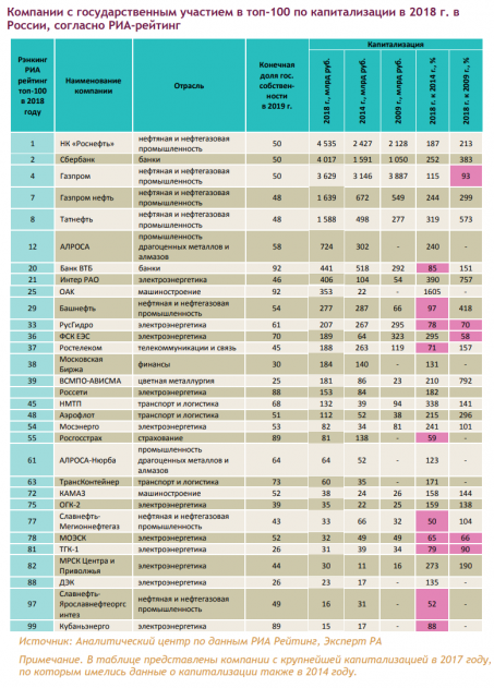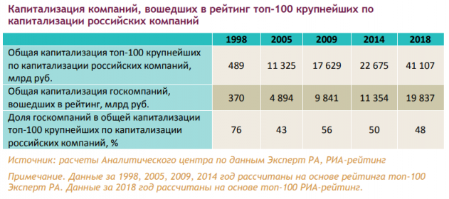 Стоимость 100 самых дорогих компаний России, по оценкам РИА Рейтинг, за год сократилась на 8,3% или на 54 млрд долл. и составила 592 млрд долл. на 31 декабря 2018 года. Доля государственных компаний в топ-100 по уровню капитализации составила 48% в стоимостном выражении.