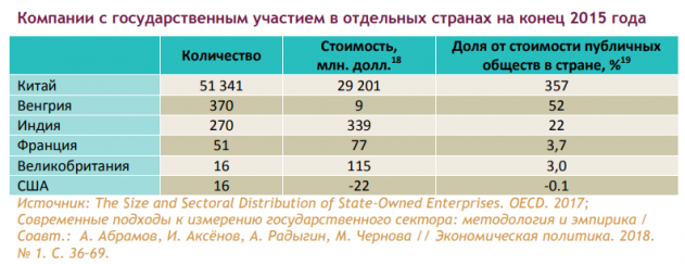 Для сравнения, по оценке OECD, в Китае общая стоимость компаний с государственным участием на конец 2015 года составила 29,2 млрд долл. или 2,1 трлн руб.