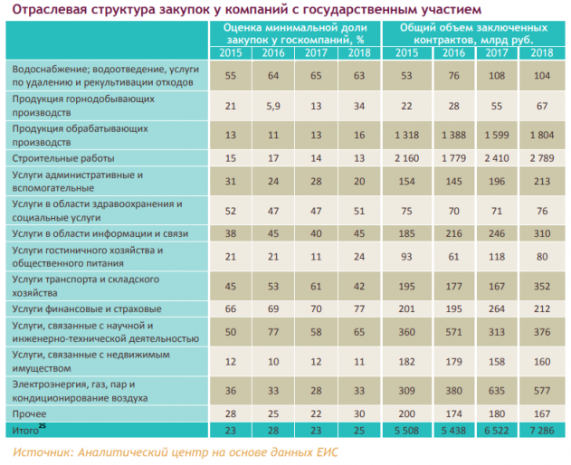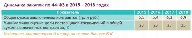 По итогам 2018 года общая сумма контрактов, заключенных государственными и муниципальными заказчиками в рамках 44-ФЗ22, составила 6,9 трлн руб. При этом в качестве поставщиков выступали как частные, так и государственные компании. Доля поставщиков из числа госкомпаний в 2018 году по минимальной оценке составила 25% . В то же время фактическая доля может быть выше за счет поставщиков, которые не указали в качестве основания для осуществления закупок по Федеральному закону от № 223-ФЗ «О закупках товаров, работ, услуг отдельными видами юридических лиц» принадлежность к компаниям с государственным участием. (К примеру, ПАО «МОЭК» относится к госкомпаниям (доля государства – 49%). Однако в качестве обоснования осуществления закупок по 223-ФЗ указано только то, что МОЭК является субъектом естественных монополий.)