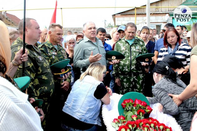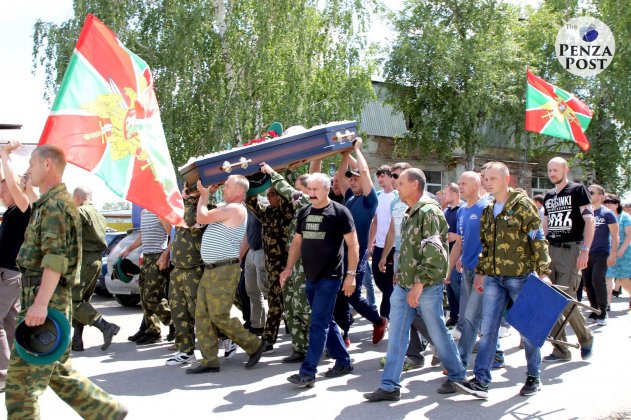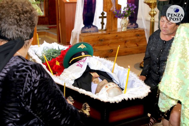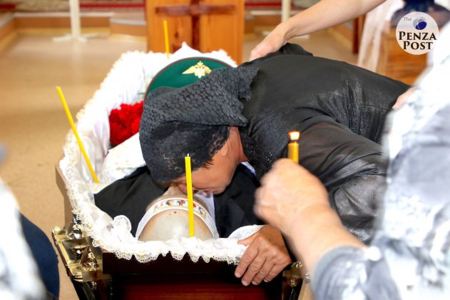 Прощание с погибшим русским мужиком Владимиром Грушиным (служил в пограничных войсках, участвовал в антитеррористической операции в Чечне, вернулся и работал водителем, убит в родном селе; остались вдова, маленькая дочка и родители-пенсионеры). Источник