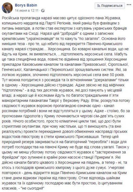 Я не удивился тому, что он написал. Одно могу сказать – бред сумасшедшего. Недавно в Маячке Олешковского района прошло собрание жителей этого села. Чтобы меня не обвиняли в том, кто на самом деле уничтожил дренажную систему, водные сооружения, систему откачки воды, украл насосы, прекратил поставку электроэнергии, я предлагаю Вам послушать маленький сюжет. В нем выступает Юрий Одарченко – первый губернатор Херсонской области в постмайданной Украине, он же по распоряжению кровавого Турчинова, Порошенко подписал все необходимые документы по блокированию Северо-Крымского канала.