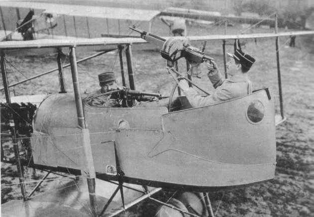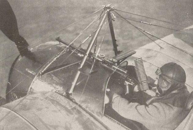 До того, чтобы запихнуть пулемет в крыло, было еще лет 20, так что началось все с установки пулемета на верхнее крыло биплана. Либо применение конструкции с толкающим винтом, тогда было проще это сообразить и посадить перед пилотом или рядом с ним еще и стрелка.