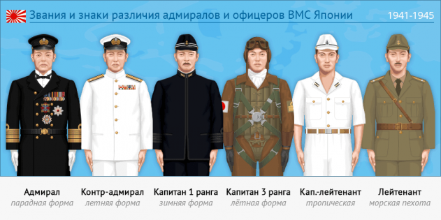 «Чего тут долго тянуть, забираем всё у британцев!». Японцы в конце XIX века, создавая новый флот, задумались и о новой форме. Ведь любые вооружённые силы — это организация, которой просто не бывает без системы званий и знаков различия. Что же в итоге получилось у жителей Страны восходящего солнца? Младший младший командир Создавая в конце XIX века новый флот, японцы не стали изобретать велосипед. Впрочем, как и во многих других областях. Как и первый русский император полутора веками ранее, они просто взяли лучшее из уже имевшегося за границей. В полной мере это относилось и к военно-морской форме. Плюнув на традиции и прочую самобытность, они взяли за основу форму своих главных учителей — британцев. А вот что японцы — в отличие от Петра I — не сочли нужным копировать, так это систему званий. Вместо запутанной европейской системы, сложившейся в результате многовековой эволюции, они приняли гораздо более простую и логичную схему «три по три». Которую, впрочем, они тоже позаимствовали… но уже у китайцев и в совсем стародавние времена. Низшее из этих званий, сёи (лейтенант), можно перевести как «младший младший командир». За ним следуют «средний младший командир», «старший младший командир», «младший средний командир», и так далее… Вплоть до тайсё — «старший старший командир» (полный адмирал). В результате, все девять званий записываются всего шестью иероглифами-кандзи. Кроме того, эти звания, в отличие от европейских, у японцев были одинаковыми как на флоте, так и в армии. Но знаки различия были практически цельнотянутыми у тех же британцев. Единственное, в чём японский флот решил остаться самобытным, так это в значках на погонах и петлицах. Вместо принятых в большинстве флотов звёздочек с разным количеством лучей, они решили использовать пусть и пятиконечные, но цветки сакуры. Знай наших! В отличие от японской же армии, где выпендриваться не стали. Строго говоря, в Императорском флоте Японии было ещё два адмиральских звания. Но одно из них, Гэнсуй тайсё (маршал-адмирал), было скорей почётным титулом, присваивалось за особые заслуги и не имело своих знаков различия, кроме нагрудного знака. А второе, Дай гэнсуй (главный маршал), автоматически присваивалось Верховному главнокомандующему. То есть только императору. Более-менее настоящие офицеры ВМС Японии не застали периода болезненной ломки, связанной с переходом от парусного флота к современному. Что не помешало им в полной мере унаследовать от своих британских учителей ревностное отношение «строевых офицеров» к техническим и прочим специалистам, тоже внезапно получившим право на офицерские, а то и адмиральские звания. Только строевые офицеры и адмиралы имели право командовать кораблями или соединениями. Это подчёркивалось, в том числе, и знаками различия: только им полагалось благородное «золото на чёрном». А знаки различия презренных «спецов» и прочей «мазуты» дополнялись, по британскому образцу, цветными вставками, обозначавшими их узкую специальность. Как и во многих других флотах, в ВМС Японии производили в офицеры и людей без формального высшего образования, поднявшихся из нижних чинов. Но, несмотря на звания, их статус и должностные обязанности были ближе к мичманам. Чтобы это подчеркнуть, их называли «офицерами специальной службы». До конца 1942 года нарукавные знаки различ