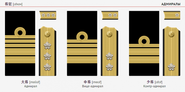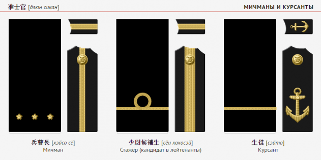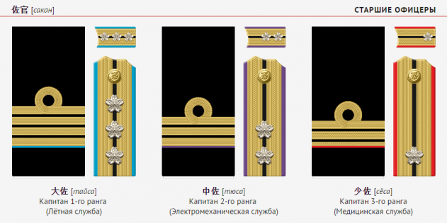 Низшее из этих званий, сёи (лейтенант), можно перевести как «младший младший командир». За ним следуют «средний младший командир», «старший младший командир», «младший средний командир», и так далее… Вплоть до тайсё — «старший старший командир» (полный адмирал). В результате, все девять званий записываются всего шестью иероглифами-кандзи. Кроме того, эти звания, в отличие от европейских, у японцев были одинаковыми как на флоте, так и в армии.