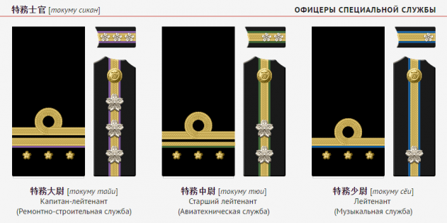 Как и во многих других флотах, в ВМС Японии производили в офицеры и людей без формального высшего образования, поднявшихся из нижних чинов. Но, несмотря на звания, их статус и должностные обязанности были ближе к мичманам. Чтобы это подчеркнуть, их называли «офицерами специальной службы». До конца 1942 года нарукавные знаки различия дополнялись мичманскими звёздочками-сакурами под офицерскими галунами — дабы помнили своё место.