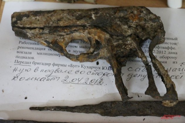 В подземельях вокзала Бреста до сих пор находят человеческие кости и оружие. Савва Шпудейко показывает хранящиеся в музее ржавый немецкий пистолет «Вальтер» и почти рассыпавшийся от старости советский револьвер «Наган» — их обнаружили ремонтники во время работ в подвале в 2011 году.