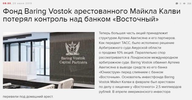 1) Итак, сначала о менее важном. Но необходимом, чтоб сразу отделить мух от котлет и "не отвлекаться на негодный объект": дело собственно Майкла Калви (сотрудника БВ) и корпоративный спор самого западного фонда "Бэринг Восток" с российским фондом "Фонвижн" за банк "Восточный"- это две разных истории. Калви сидит под домашним арестом (до этого сидел в СИЗО) за какие-то там личные (его и еще нескольких менеджеров) махинации с акциями. Задержали по подозрению в хищении имущества на 2,5 млрд рублей: уголовное дело по ч. 4 ст. 159 УК РФ. В итоге его отпустят, конечно. Урегулируют, или оправдают или условку дадут. Никому в РФ "токсичный актив" в виде физического туловища гражданина США в российских лагерях не нужен. НО. Внимание. Вся эта шумиха вокруг дела Майкла Калви, все эти оры в "деловых" и либеральных (часто это одно и то же) СМИ, личные вписывания за него глав крупных российских корпораций (например, Грефа), статьи в Financial Times - это именно отвлечение на негодный объект. Да, согласен, даже сам по себе факт ареста и судебного преследования высокопоставленно менеджера западной компании, да еще и породистого WASPa (см.фото), выпускника (магистр финансов) Лондонской школы экономики - это уже само по себе необычное явление для страны которую некоторые, и даже многие, называют "колонией Запада". Но прикол здесь в том, что самый смак вовсе НЕ в деле этого Калви! А во второй истории, оставшейся несколько в тени (и может даже не случайно). 2) Теперь о важном. А именно о корпоративном споре двух фондов- западного БВ и российского "Фонвижн" (основной собственник Артем Аветисян, бывший рук-ль Агентства Стратегических Инициатив). Спор идет о собственности на российский банк "Восточный". Я не финансист и не юрист. Ну спорят и спорят. И вот сегодня, 20 июня 2019, тихонько, где-то в уголке информационных лент, проскакивает даже кое-какой промежуточный итог их спора. Я решил взять скрин новости со всеми нами любимой радиостанции: