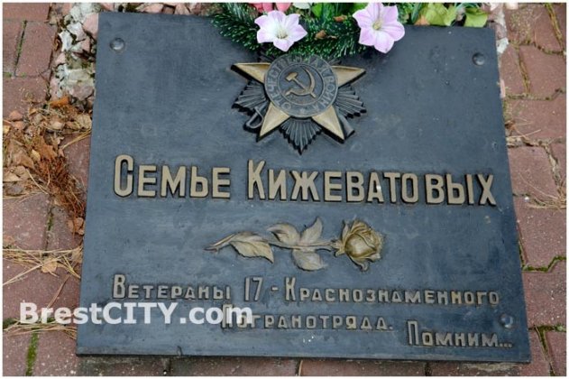 "Здесь захоронены замученные и расстрелянные немецко-фашистскими оккупантами семья Героя Советского Союза А.Кижеватова: