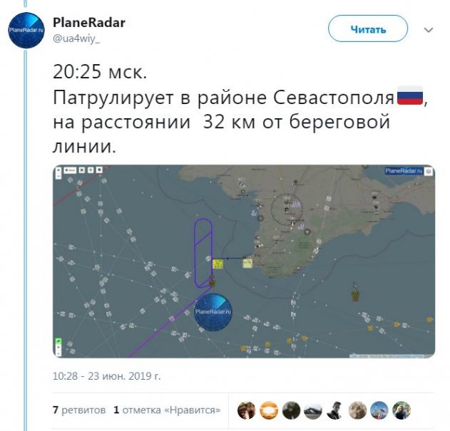Кроме того, в 19:55 мск патрульный противолодочный самолет ВМС США P-8A Poseidon с бортовым номером 169332 поднялся в небо с того же полигона Сигонелла и направился к южным границам Крыма. Высота полета составила почти восемь километров над землей, скорость — 792,5 километра в час. В 20:25 мск Boeing оказался на расстоянии в 32 километра от береговой линии в районе Севастополя.