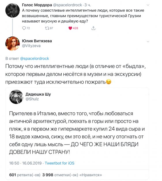 С другой стороны, просто взять и признать, что в Сочи жарят не менее вкусный шашлык, а в Крыму не менее сочные чебуреки, чем в Тбилиси, что Краснодарский хамон воняет так же, как испанский, что сделанный в Подмосковье сыр ничем не уступает французскому, а вологодское сливочное масло вкуснее швейцарского, - для них означает предательство. Своих идей и лозунгов, согласно которым в России нет ничего хорошего. Более того, как только они похвалят отечественный продукт, производителя или даже рецепт приготовления тирамису в ресторане своего города, они тут же растеряют свою многочисленную аудиторию из адептов секты свидетелей благородной белой плесни, вывести которую можно исключительно в регионе Иль-де-Франс, но никак не под Псковом.