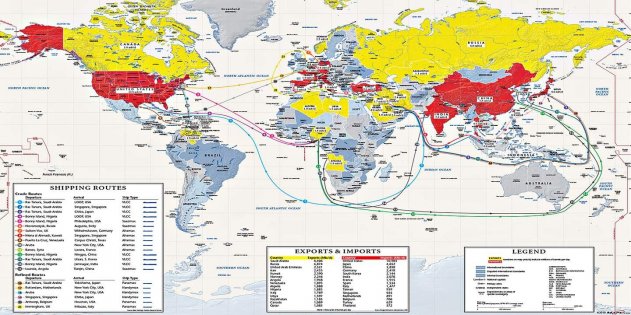 Мировые экспортёры и импортёры нефти и пути её перевозки При этом танкерное движение — это не хаотичные дёргания, а конкретные, строго определённые маршруты. Можно выделить несколько наиболее загруженных направлений. Это, прежде всего, маршруты к основным потребителям нефти. Среди них — США (19,7% мирового потребления), Китай (12,9%), Индия, Япония, Корея — вместе ещё 11,5%. Всего пять стран — и почти 45 процентов мирового потребления. При этом они имеют свою сеть маршрутов, ещё более компактную, чем в целом у танкерного флота.