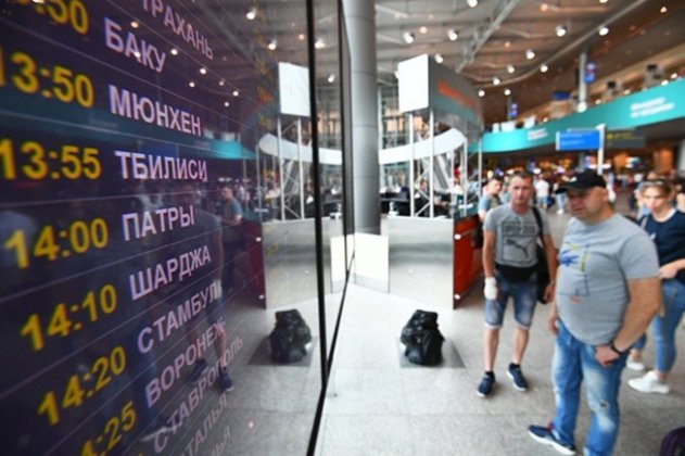 Информационное табло с расписанием авиарейсов в аэропорту Домодедово. 21 июня 2019 года президент Владимир Путин подписал указ, запрещающий авиакомпаниям с 8 июля осуществлять перевозки из России в Грузию.