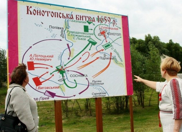 В ходе 13-летней войны 1654 — 1667 годов русские войска потерпели не одно поражение: первый неудачный штурм Смоленска в августе 1654-го, битва у Полонки под Барановичами в июне 1660-го, на Кушликовых Горах под Полоцком в октябре 1961-го и другие, включая страшную катастрофу армии Василия Шереметьева в Чудновской битве сентября — ноября 1660 года. Но Смоленск никак не годится для «борьбы украинского народа за свободу», Чуднов — в Житомирской области, а Виктор Андреевич родом из Сумской. Вот Конотоп и стал одним из мест «народження нації». Что же там произошло?