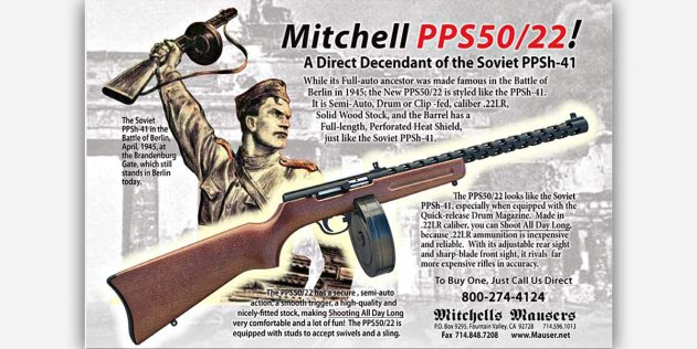 А вот за рубежом «мелкашки» такого типа вполне прижились — правда, не как охотничье, а как полицейское и «развлекательное» оружие. Один из таких образцов, в частности, до сих пор выпускает итальянская компания «Пиетта» под наименованием PPS-50. Что любопытно, рекламируется он как подражание советскому ППШ-41, и в нём применяются не только секторные, но и барабанные магазины.