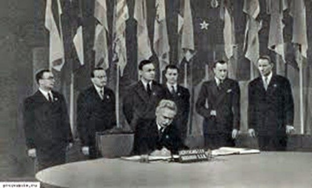26 июня 1945 года на международной конференции в Сан-Франциско в присутствии более чем солидных свидетелей глава делегации УССР, нарком иностранных дел республики Дмитрий Захарович Мануильский подписал Устав ООН, поставив УССР (вместе с СССР и Белорусской ССР) в число государств-основателей этой организации.