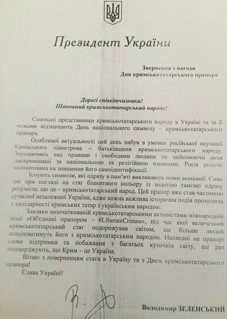 Президент также добавил, что «каждое важное историческое событие проходило в солидарности крымских татар с украинским народом», подчеркнул, что считает, что «Крым – это Украина» и заканчивает лозунгом «Слава Украине».
