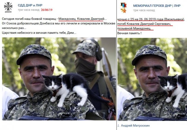 По информации источника, его имя — Ковалев Дмитрий Сергеевич «Македонец» (09/08/77, Макеевка). Погиб ночью 25-26/06/19 в р-не н.п. Васильевка.