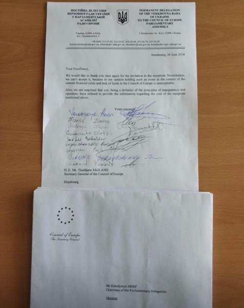 В письме говорится, что украинская делегация не будет принимать участие в банкете ввиду «экономического кризиса» в ПАСЕ. Напомним, в том числе эта проблема стала причиной возвращения одного из основных плательщиков взносов – России в ПАСЕ.
