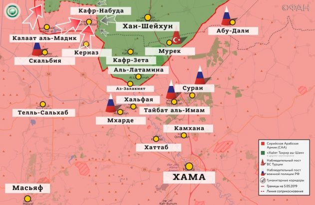 Сирийская армия пока что не продвигается вперед в в горных районах у поселка Тель-Маллах и ведет обстрел из артиллерии по позициям террористов, ударяя по бронетехнике и пулеметным установкам радикалов. ВВС Сирии с воздуха наносят авиаудары по расположениям «Тахрир аш-Шам» и «Джейш аль-Изза» у города Мурек, поселка Хасрая, в предместьях Телль Малаха, о чем сообщил новостной портал Baladi News.
