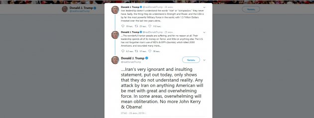 Есть все основания полагать, что в третьем твите президент США говорил об ударе по Ирану с применением ядерных средств поражения. Следует заметить, что в Иране это хорошо поняли. 26 июня на вопрос корреспондента CNN по поводу угрозы со стороны Дональда Трампа глава МИД Ирана Мохаммад Джавад Зариф ответил: «Это заявление свидетельствует, что намерения США незаконны, США не в том положении, чтобы уничтожить Иран, у них нет возможностей, кроме как использовать запрещенное оружие».