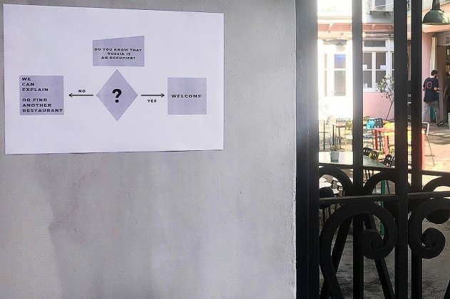 Но не тут то было. Сразу, при входе, начался квест. Висит табличка на английском, дескать, признаешь, что Россия - оккупант, тогда велкам. Не признаешь – «рядом есть другие рестораны».