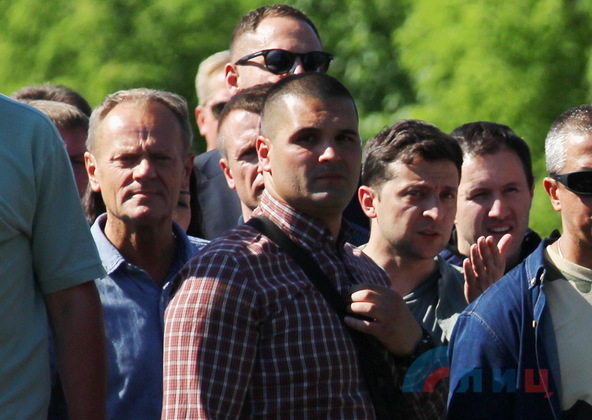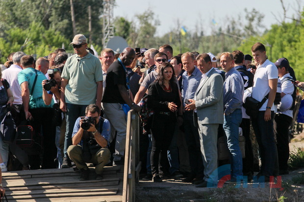 После осмотра установленной представителями Специальной мониторинговой миссии (СММ) ОБСЕ видеокамеры Зеленский и Туск покинули район разрушенного моста и удалились в сторону Станицы Луганской.